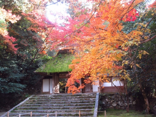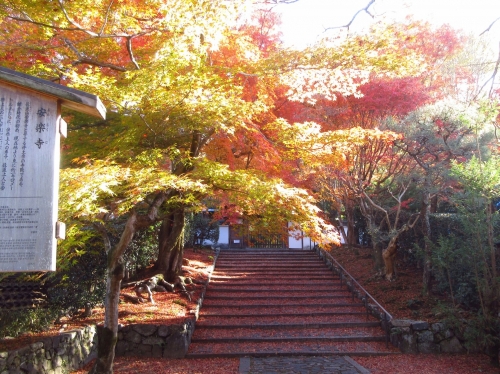 疎水沿いの哲学の道を進み、安楽寺です。まだ開門前で人が入ってない写真が撮れましたが、たくさんの人が写真を撮っていました。階段に積もっている赤い落ち葉がきれいです。