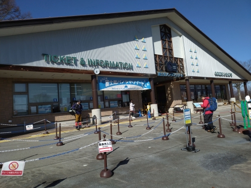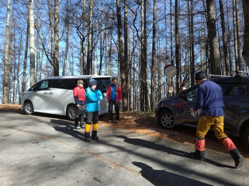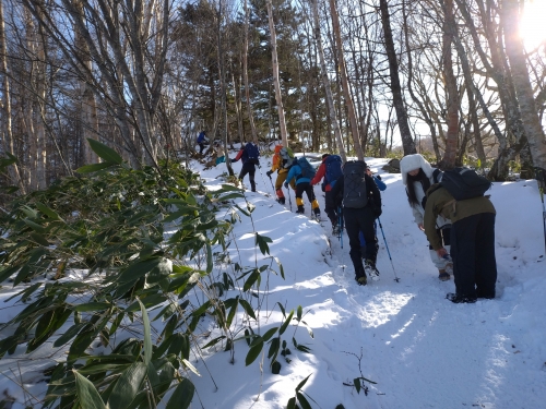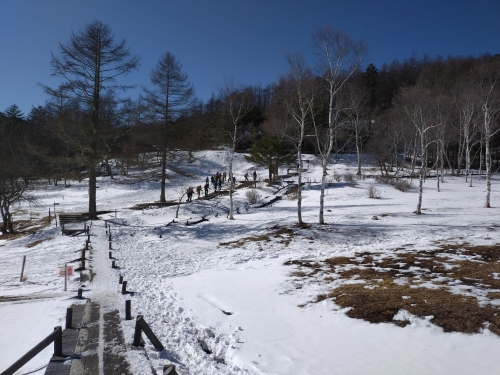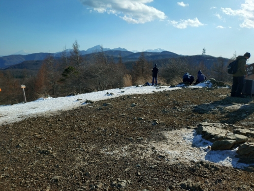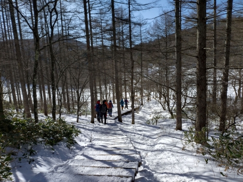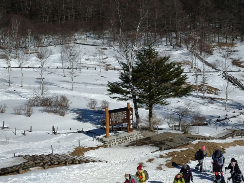 今回の山行は、暖かい日で雪が少なく、チェーンスパイク、軽アイゼンで十分でしたが、もう一度冬季に来ることがあれば、是非、霧氷の付いたカラ松の林を歩き、白一色の山頂から絶景を楽しみたいと思いました。