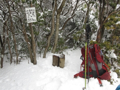 愛宕山三角点に到着。この先の竜ヶ岳に向かう雪の稜線が気持ち良いのですが、最近はそこまで行く元気がなくなりました。今日はここで引き返します。