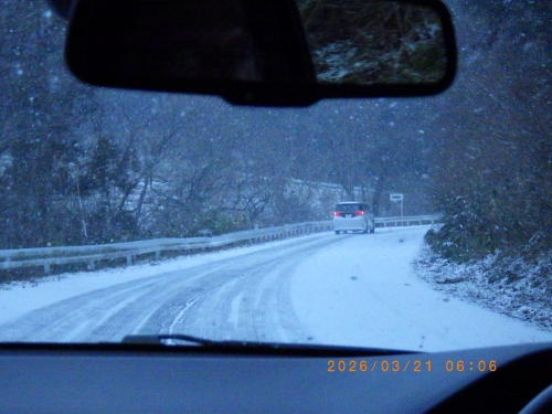 リフト運行開始時間に余裕をみて6時過ぎに出発。昨日夜から少し降っていた雪が本降りとなり、道路を覆うようになりました。前を走っていた他の人の車が上れなくなって、バックで降りてきました。