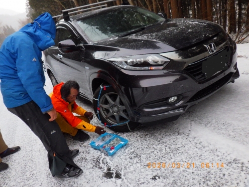 私たちもこのまま進むのは危険となって、めったに使わないチェーンを装着しました。