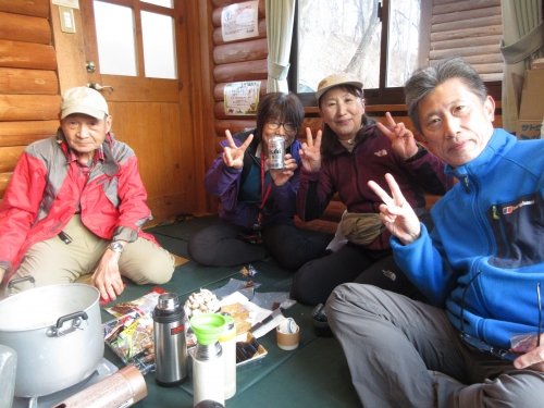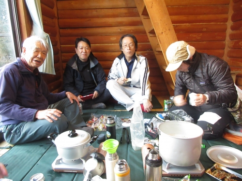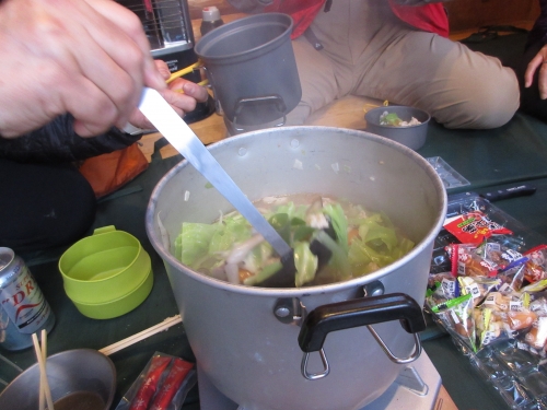 途中のスーパーで購入した食材で宴会です。コンロや鍋の重さを考えなくて良いので楽です。