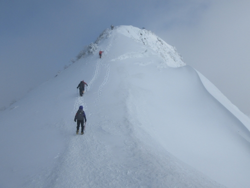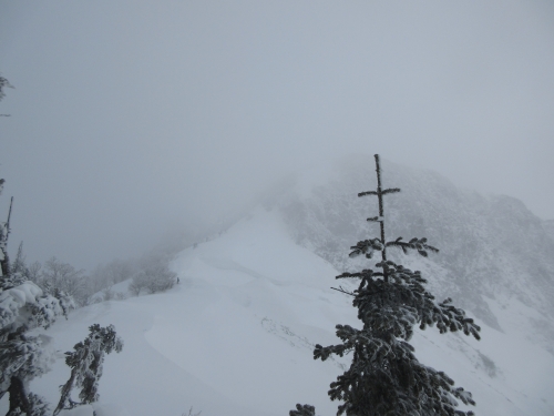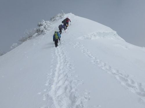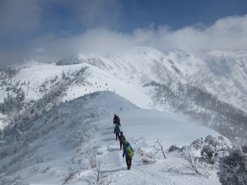 ヤマテンの予報では午前中の気温は-13℃~-6℃、風速は24m~19mで、風速はそれほどではなかったと思いますが、厳しい冬山となりました。狭いリッジ状のところでは、風でバランスを崩しそうでした。