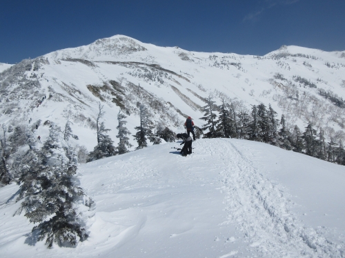 アップで見ると右肩に蟻のように人が見え、結構急な雪面を降りてきたようです。